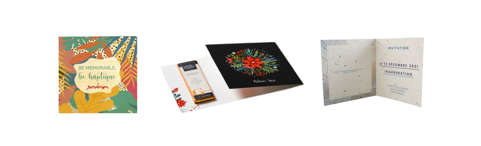 Une manière innovante de se démarquer est d’ajouter une dimension sensorielle avec des cartes gourmandes, accompagnées de douceurs telles que du chocolat ou des sablés personnalisés. Parmi ces options, le produit Carte gourmande avec barre de chocolat 10G permet de personnaliser une carte avec une touche sucrée, idéale pour offrir une expérience gustative et visuelle unique à vos clients. Cette carte, parfaite pour la période de fin d’année, allie un design raffiné à une gourmandise qui saura ravir les papilles de vos partenaires.